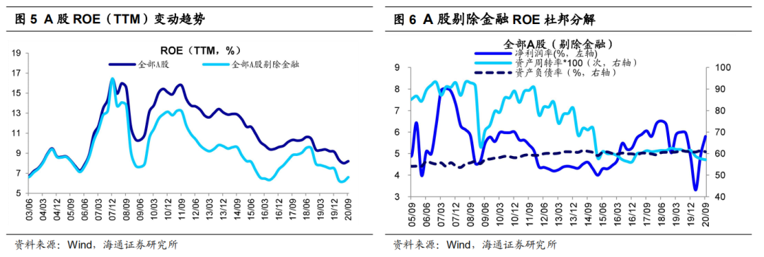 ROE见底回升,20Q3全部A股ROE为8.2%。20Q3/20Q2/20Q1/19Q4/19Q3全部A股ROE(TTM,整体法,下同)为8.2%/8.0%/8.2%/9.0%/9.2%,2005年以来的均值为11.3%,处于05年以来从低到高10.1%的分位。20Q3/20Q2/20Q1/19Q4/19Q3全部A股剔除金融后ROE为6.6%/6.2%/6.1%/7.3%/7.4%,2005年以来的均值为9.3%,处于05年以来从低到高8.6%的分位。整体上看,ROE虽然还处在历史低位,但是已进入复苏的趋势中。回顾最近一轮盈利周期,A股ROE自16年下半年开始回升,从16Q2低点9.4%升至18Q2高点10.6%,此后开始回落至20Q2的低点8.0%,我们认为,20Q3将是一轮ROE上行周期的起点,历史经验显示ROE一轮周期持续3-4年,此轮ROE的回升还将持续一段时间。用三因子的杜邦公式来拆解ROE,我们发现ROE回升的动力主要来自于需求端的回暖:企业的净利率已恢复至疫情前的水平20Q3/20Q2/20Q1/19Q4/19Q3全部A股净利率为9.1%/8.4%/8.3%/8.1%/9.7%,2005年以来的均值为8.9%;剔除金融后为5.8%/4.9%/3.3%/4.7%/5.9%,2005年以来的均值为5.6%。但企业的周转率还未明显回升,非金融企业的周转率依旧在下行通道中:20Q3/20Q2/20Q1/19Q4/19Q3全部A股资产周转率为0.167/0.167/0.168/0.179/0.186次,2005年以来的均值为0.237次;剔除金融后为0.572/0.577/0.589/0.616/0.614次,2005年以来的均值为0.73次。此外,企业的负债率从前期高位有所下降:20Q3/20Q2/20Q1/19Q4/19Q3全部A股资产负债率为83.9%/84.2%/83.9%/83.7%/83.3%,2005年以来的均值为82.2%;剔除金融后为60.9%/61.5%/60.8%/60.9%/61.1%,2005年以来的均值为58.1%。