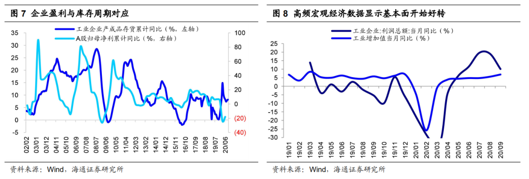 宏观角度看,库存回升周期将持续至明年二、三季度。我们认为驱动基本面好转的主要因素有两个:一是经济周期因素。根据库存周期理论,2002年至今市场共经历了6轮库存周期,平均持续39个月。如果没有疫情,按照历史经验,19年四季度我国进入补库存周期,但是疫情冲击下补库存阶段被延后了。2002年至今我国共经历了5轮库存上行周期,平均持续21个月。目前我国处在第6轮库存周期上行期,这次工业企业产成品库存累计同比从2019年11月开始见底回升,已经持续了11个月。由于疫情导致补库存阶段延后,按照历史经验推算,预计这次工业补库存阶段将持续至2021年二、三季度。二是政策推进。今年赤字率拟按3.6%以上安排,赤字规模比去年增加1万亿元,此外,今年还将发行1万亿元抗疫特别国债以及3.75万亿地方政府专项债(较去年增加1.6万亿),因此整体广义赤字较去年增加了3.6万亿。我们预计实际上广义赤字率从去年5%可能升至8%。随着“两会”开完后政策逐步落地,货币、财政政策发力后将助推基本面数据回升。最新披露的宏观数据显示基本面开始好转,20Q3我国GDP单季度实际同比增速为4.9%,较20Q1/20Q2的-6.8%/3.2%大幅改善,其中代表生产的工业增加值单月同比增速从2月的-25.9%最低点回升到9月的6.9%,工业企业利润总额当月同比增速从3月的-34.9%最低点回升到7月最高的19.6%,基本面回升态势非常明显,已经接近甚至超过疫情前正常水平。一般来说,社融增速领先GDP增速3-9个月,这次社会融资规模存量同比从2019年10月低点10.6%逐步回升至2020年9月的13.5%,目前仍在上升趋势中。我们认为未来两个季度GDP回升趋势较为确定,明年二季度GDP增速即使回落,GDP增速绝对值也比较高,库存回升周期将持续至明年二、三季度。