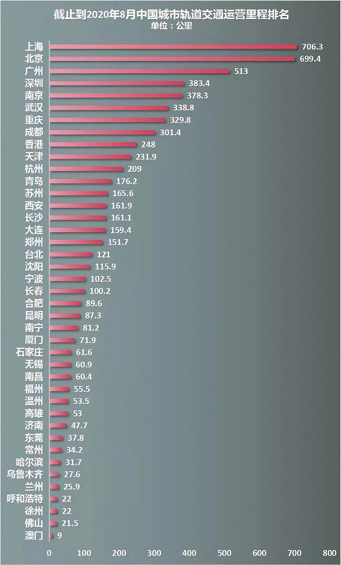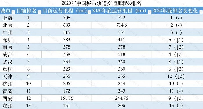 初步统计,到年底,主要城市的轨道交通运营里程排名如下: