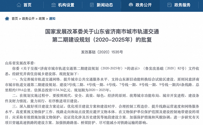 10月30日,济南市城市轨道交通第二期建设规划(2020-2025年)获批,涉及6条线路,总里程约159.6公里,估算总投资1154.36亿元。
