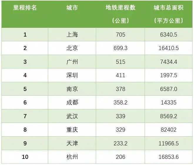 根据21世纪经济报道的统计,截至目前中国内地轨道交通十强城市分别为: