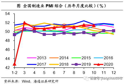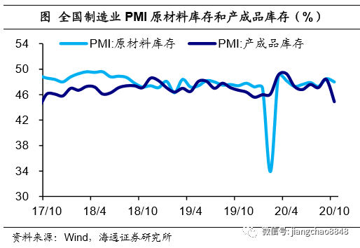 生产稳在高位,就业略有回落。10月生产指数稳定在53.9%,创14年以来同期新高。从中观高频数据来看,10月以来工业生产不温不火,行业开工率涨跌互现,但是部分传统制造业恢复有所加快,印证Mysteel样本钢企钢材产量增速稳中向好。10月制造业PMI从业人员指数自9月的49.6%略回落至49.3%,处于历年同期高位水平。近期人社部定于2020年第四季度在全国开展就业创业服务攻坚季行动,有效解决重点群体联系不及时、服务针对性不强等问题,集中帮扶离校未就业高校毕业生、登记失业人员、农民工等重点群体就业创业,确保年底前完成各项目标任务,预计未来就业形势总体稳定。