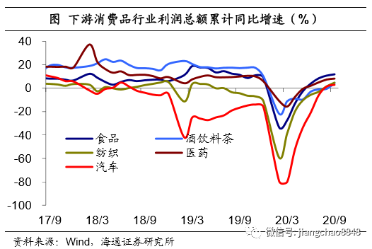行业利润涨多跌少。1-9月各行业利润增速涨多跌少,分上中下游看:下游利润普遍上行,其中食品、饮料、纺织、医药、汽车增速均有所回升。中游涨跌互现,其中通用设备、电气机械、电力热力增速回升,而专用设备和计算机电子设备增速有所回落。上游利润增速涨多跌少,其中有色利润增速由负转正,化工、钢铁、建材降幅继续收窄,化纤增速有所回落。