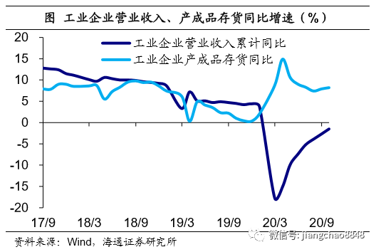 企业库存明显回补。9月末工业企业产成品存货增速继续上行至8.2%,库存增速已连续两个月回升。9月份工业企业库存销售比继续回落至45.2%,低于过去两年同期水平,而9月份存货周转天数同比增加1.7天至18.9天,同比增幅下滑意味着去库压力已然减轻。工业企业正由被动去库向主动补库切换。