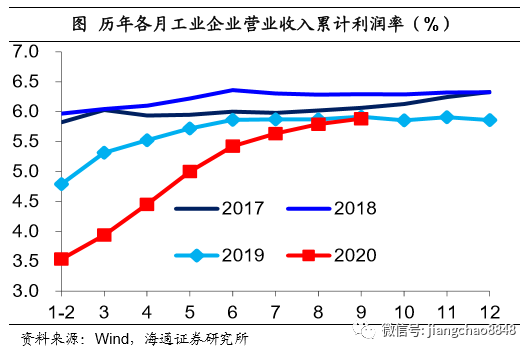 工业利润率继续上行。9月份每百元营业收入中的成本费用下降至93.18元,同比增幅也有所回落。相应地,1-9月份工业企业营业收入利润率升至5.88%。