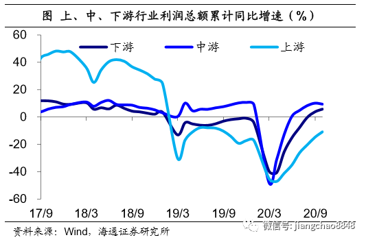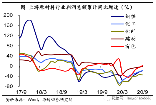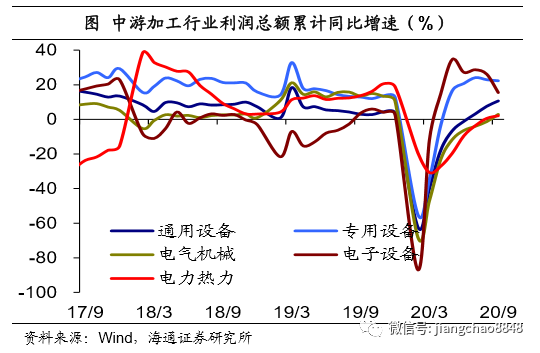 上游利润增速领跑。1-9月份,在41个工业大类行业中,21个行业利润总额同比增加,20个行业同比减少。而从9月当月增速来看,上中下游行业利润增速普遍回落,其中原材料制造业利润增速依然领跑,特别是石油加工、有色等行业利润增速改善幅度较大,下游消费品类行业利润增速稳中趋缓,而中游装备制造业利润增速明显下滑。