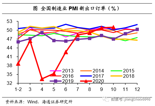 内外需稳步改善。10月新订单指数持平于9月的52.8%,处于13年以来同期次高点,指向内需稳步改善。10月新出口订单指数由9月的50.8%继续上行至51%,创下18年6月以来新高,也是13年以来同期新高,指向外需依然偏强。