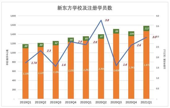 学校规模远大于教学中心,2021财年一季度末学校和教学中心总数中,学校占比7.61%,2020财一季度末这个比例是7.53%。也就是说,在学校占比略微提高的情况下,“学校+教学中心”的平均收入下降了21%。