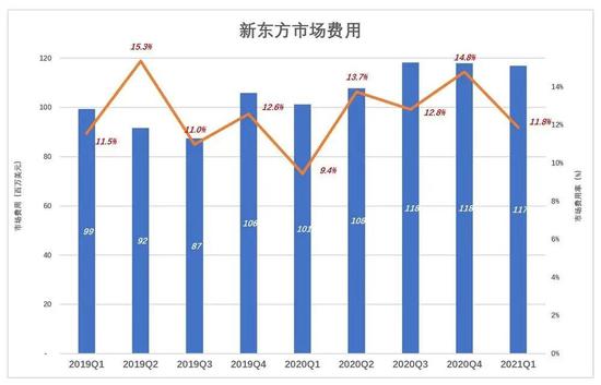 由于品牌深入人心,新东方市场费用在招生旺季约占营收的15%,淡季约为11%。2021财年Q1市场费用1.2亿美元,占营收的11.8%。