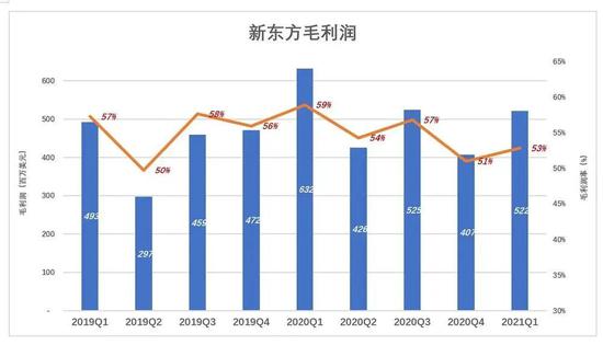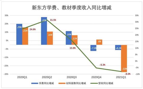 疫情对新东方线下授课造成一定影响,2020财年Q4学费收入同比下降7.3%。2021财年Q1,教学、教材收入分别下降6.1%和33%,由于教学收入占比远远大于教材销售,因此总营收降幅仅为8%,看起来不算触目惊心。