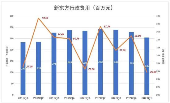 对新东方业绩影响较大的是高企的行政费用。最近11个财季,新东方行政费用连续超过2亿美元。