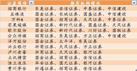 其中46只个股入选2家以上券商金股名单。分众传媒、歌尔股份、芒果超媒、万科A、五粮液、招商银行6家公司获4家机构推荐,贵州茅台、恒立液压、立讯精密、泸州老窖、兴业银行、洋河股份6家公司获3家机构推荐。长春高新、广汽集团、昊华科技、和而泰、淮北矿业、江苏神通、京东方A、晶澳科技、均胜电子等34家公司获2家机构推荐。