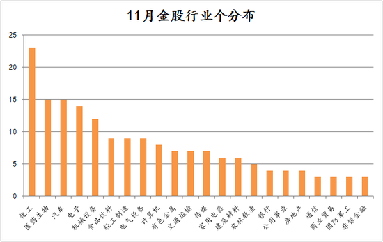 从行业分布看,化工、医药生物、汽车、电子、机械设备等行业最多,均涉及10只以上个股,其中化工行业涉及23只个股。
