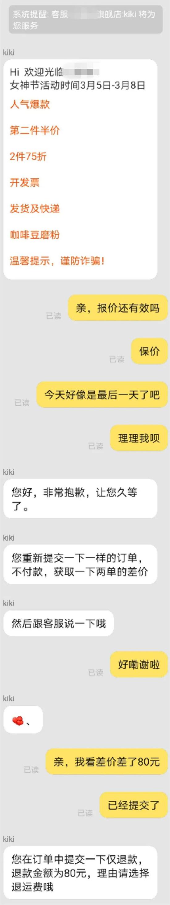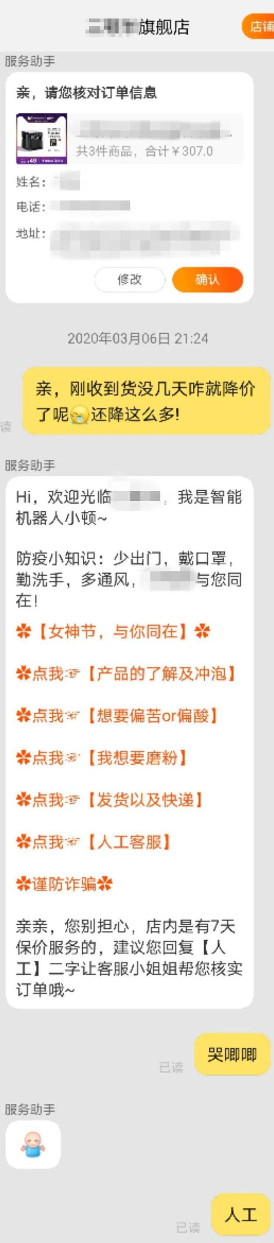 小编在今年的2月24日于某宝上购买了某品牌的咖啡,并于2月29日确认收货,收货后7天内,我无意中返回查看了该商品,发现店家正在搞活动,之前我购买的商品直接降价80元。