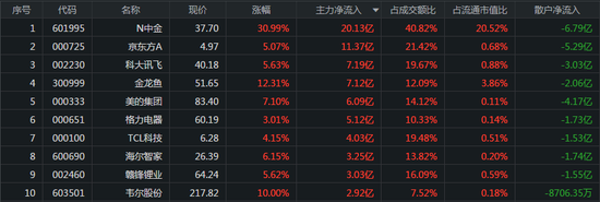 从个股来看,主力资金最青睐的3只股票分别是中金公司、京东方A、科大讯飞,流入金额分别为20.13亿元、11.37亿元、7.19亿元,所对应的涨幅分别为30.99%、5.07%、5.63%。