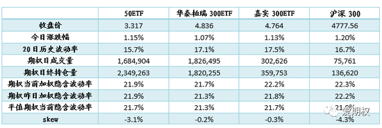 期权标的收涨1%。今日A股小幅高开,上午有所冲高,期权标的一度上涨超1.5%,随后回落,涨幅略有收窄。今日收盘,50ETF上涨1.15%,华泰柏瑞300ETF上涨1.07%、嘉实300ETF上涨1.13%,沪深300上涨1.20%。