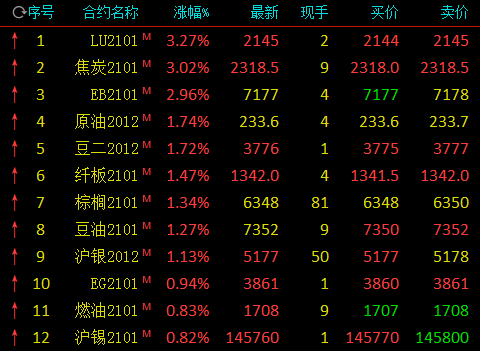 热点栏目11月4日,国内期市开盘,低硫燃油、焦炭涨逾3%,原油、豆二涨近2%,橡胶跌逾2%。