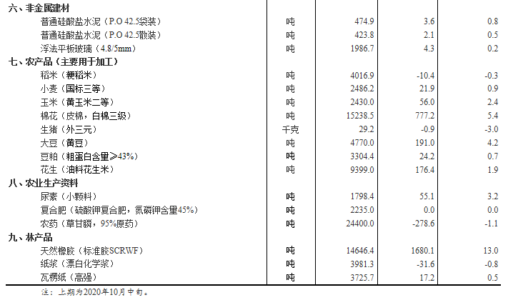 中国网财经11月4日讯 据国家统计局网站消息,据对全国流通领域9大类50种重要生产资料市场价格的监测显示,2020年10月下旬与10月中旬相比,27种产品价格上涨,18种下降,5种持平。生猪(外三元)本期价格29.2元/千克,环比下降3%。