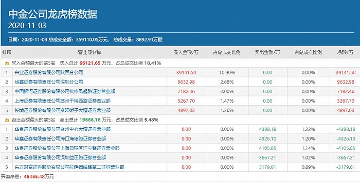 当日公布的龙虎榜数据显示,知名游资方新侠的常用席位兴业证券陕西分公司以高达3.91亿元的买入额高居中金公司买方榜首,占该股全天成交额的比例接近11%。