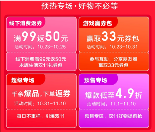 10月31日-11月10日,第二波预热火热来袭。永辉超市预售专场、超级专场盛大开启,通过全渠道不间断的花式促销,让消费者获得实实在在的优惠。同时永辉的线下内购会也将于11月6-8日再次上线,活动期间一次性线下购物实付满额即可领取双11引爆期购物券。
