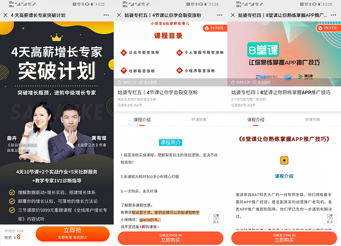 据他所说,自己经常会在网上报名听各种各样的课程,但是基本上都不花钱,偶尔有一些付费的课程,也都是十几块钱的优惠课。