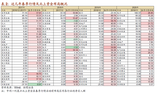 从北向资金对行业的配置情况来看,北向资金在布局春季行情阶段大举买入的行业在未来的春季行情中上涨概率较大,但涨幅并不一定占优,而北向资金在前期流出的行业在春季行情中则有涨有跌,其中像家电、电子、医药等经常成为重点买入的行业。