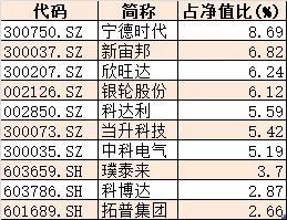 如前海开源中国稀缺资产A的宁德时代、五粮液;万家行业优选的比亚迪、汇川技术、长城汽车;金鹰信息产业A的宁德时代、新宙邦、中科电气。
