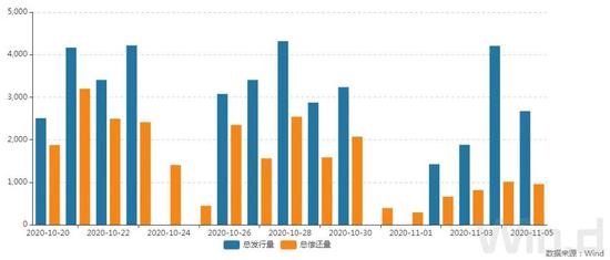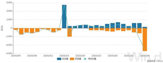 央行公告称,为维护银行体系流动性合理充裕,11月5日以利率招标方式开展了300亿元7天期逆回购操作,中标利率2.20%。此外,人民银行将于11月16日对本月到期的中期借贷便利(MLF)一次性续做,具体操作金额将根据市场需求等情况确定。Wind数据显示,当日有1400亿元逆回购和4000亿元MLF到期,据此计算,当日全口径净回笼5100亿元。
