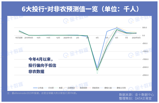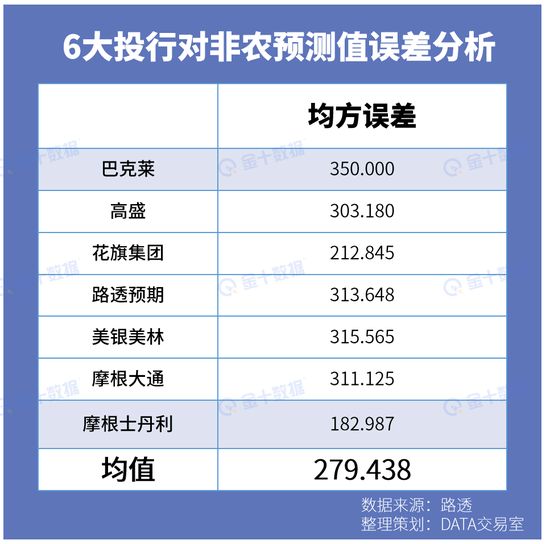 在投行方面,D哥整理了全球最大的6家投行对非农数据近一年的预期数据,并进行了误差分析*。