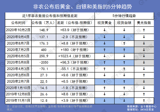 对历史数据进行了简单地统计分析后,D哥发现,过去12次非农数据公布后的5分钟内,热门交易品种黄金、白银的走势有7次根本不按预期走;美元指数有6次不按预期涨跌。