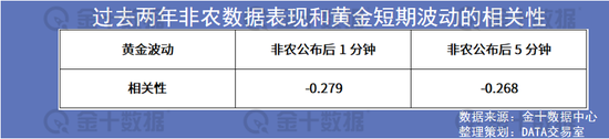 为了进一步论证上述情况是否属实,D哥还统计了过去两年每次非农数据公布后1分钟和5分钟的黄金波动情况,计算每个月非农就业人数的差值(实际值-预期值)和黄金涨跌幅之间的相关性。