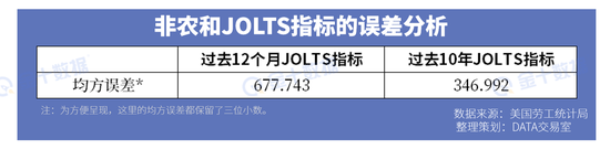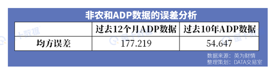 注:这里DATA交易室运用到误差分析的方法,即将指标/机构给出的预测值和非农当月的公布值进行比较,均方误差是反映预期值与公布值之间差异程度的一种度量 。