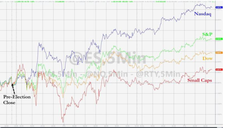 此外,在预期民主党无法夺下众议院多数席位后,金融市场也做出了反应,美股三大股指、黄金、比特币暴涨、美国十年期国债收益率暴跌、 美指也一路下行。