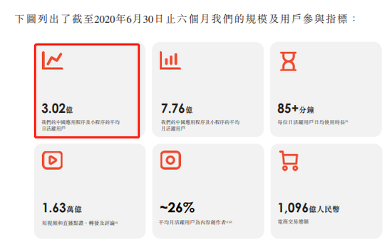 第一种口径:截至今年6月30日止6个月,快手的中国应用程序及小程序的平均日活跃用戶是3.02亿。