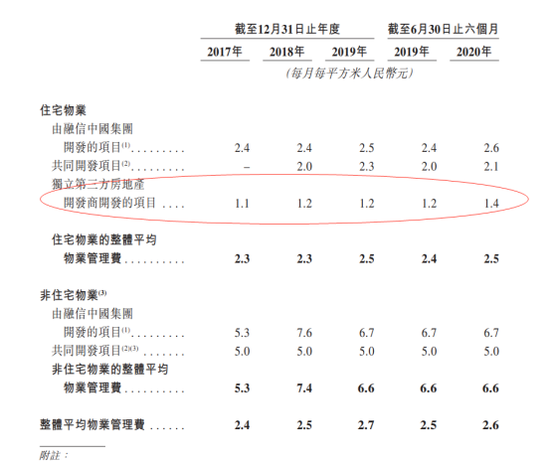 虽然公司第三方面积占比较高,且逐年增长,但第三方项目赔本赚吆喝,收费不高。资料显示,第三方房地产开发商开发的项目住宅物业平均物业管理费为1.1元、1.2元、1.2元、1.4元,同期融信集团住宅项目的平均物业费为2.4元、2.4元、2.5元、2.6元,第三方项目仅为关联方项目的一半物业费。而毛利率较高(5~8元)的非住宅物业项目,均为融信中国集团及共同开发项目,无第三方项目。