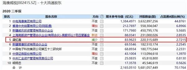 数据显示,龚虹嘉巨额减持完成后,仍然是海康威视的第二大股东和第五大流通股东。