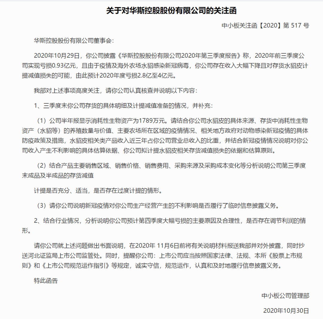 丹麦政府表示,将捕杀该国所有水貂,数量高达1500万到1700万只。在国内A股中,被称为“裘皮第一股”的华斯股份,因公司旗下有若干从事水貂育种、养殖的孙公司位于丹麦,因此受到波及,令本就亏损的业绩更加雪上加霜。