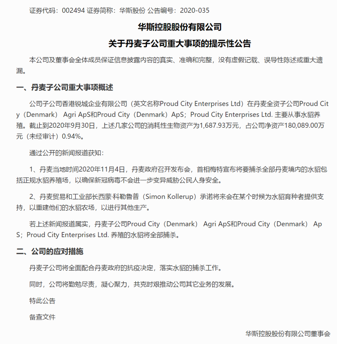 华斯股份11月5日晚间发布公告,公司子公司香港锐城企业有限公司在丹麦的若干全资子公司主要从事水貂养殖。截至2020年9月30日,几家公司的消耗性生物资产为1687.93万元。若政策属实,丹麦子公司养殖的水貂将全部捕杀。
