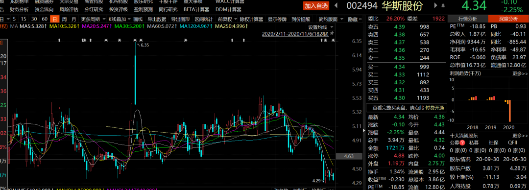 华斯股份业绩亏损在资本市场也有体现。近半年内,公司股价大幅下跌。Choice数据显示,6月5日至今,公司股价从最高6.35元/股跌至4.34元/股,跌幅达30%。