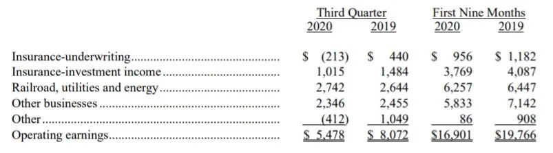 伯克希尔在财报中表示,随着3月下旬开始的COVID-19流感大流行加速,我们的大部分业务都受到了负面影响,迄今为止的影响从相对轻微到严重不等。由于零售店、餐厅和娱乐场所等人流聚集的设施关闭,我们大多数制造业、服务业和零售业的收入和收入在第二季度大幅下降,在某些情况下严重下降,公共旅行限制和某些公司的关闭。在2020年第三季度,与第二季度相比,其中几家公司的收入和收益大幅增长。