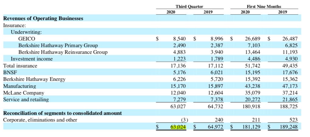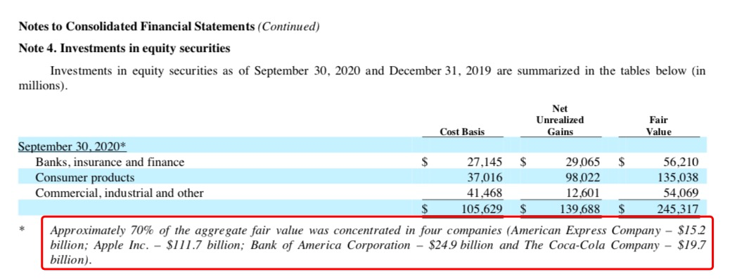 截至2020年9月30日,伯克希尔投资的账面价值约为131亿美元,截至2019年12月31日,账面价值约为138亿美元。
