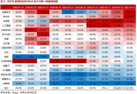 就2020年盈利预测而言,增速居前的板块有车联网、半导体制造、人工智能、卫星互联网、消费电子,与此同时,光伏、军工类(导弹、航空发动机、军工材料)、金融IT等的盈利预测连续多次上修。