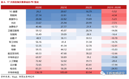 进一步看2022年PE,5G基建、物联网、数据中心在15-20之间,光伏、消费电子、卫星互联网、车联网在20-30之间,金融IT、军工类(军工材料、导弹、航空发动机)、信创、半导体设计、人工智能在30-40之间。