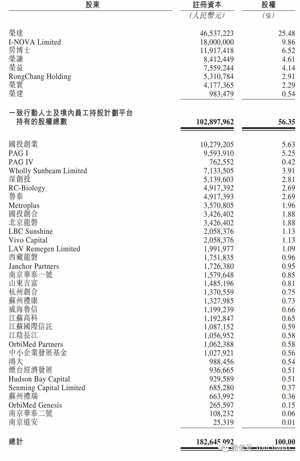 国投创业持股5.63%,PAG I 持股为5.25%,深创投持股为2.81%,OrbiMed Partners持股为0.58%,OrbiMed Genesis持股为0.15%。