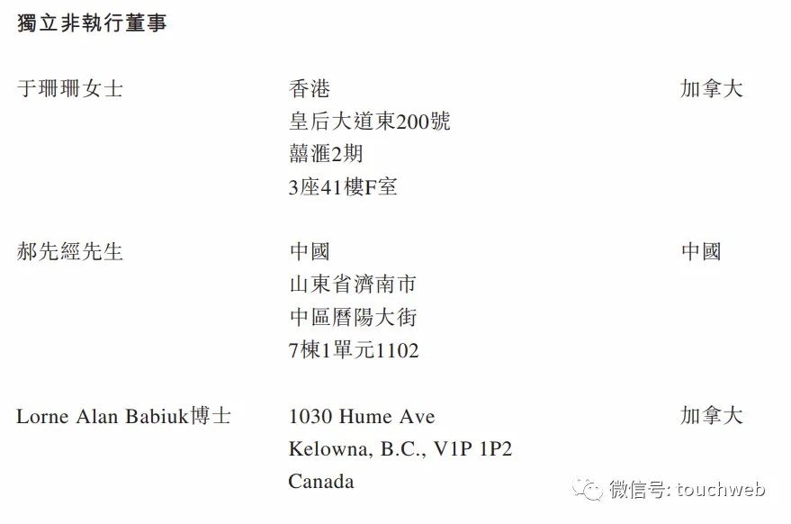 独立非执行董事为于珊珊、郝先经、LorneAlanBabiuk博士。
