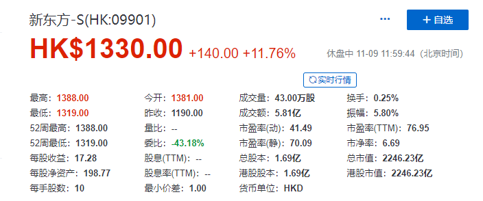 新东方发行价为1190港元,首日早盘高开约16%。截至上午收盘,新东方上涨11.76%,报1330港元,成为港股首只千元股。