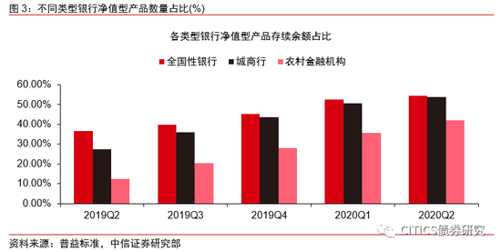 此外,普益标准分银行类型统计了净值型产品存续余额占比,从下图可以看出,截至2020上半年末,作为理财发行主体的全国性银行和城商行,净值型产品余额已超过50%,和上述新闻报道里所披露的数据基本吻合,而农村金融机构的数据也已经突破了四成。