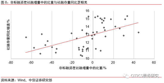 其三是对实体经济的外部性。由于国内居民对期限较长的资管产品的偏好程度较低,期限匹配意味着大量期限较长的,与实体经济融资相关的底层资产都难以与资管产品资金对接。因此资管新规的全面落地势必会造成实体经济融资环境在一段时间内陷入比较艰难的处境。企业融资和以城投平台非标形式进行的地方政府融资,期限往往较长,通过发新资管产品承接的难度较大,同时新的非标融资渠道也会受到一定的影响。非标融资作为信贷的重要补充,根据下图7,分析发现非标融资在社融增量中的比重与社融存量同比正相关。虽然长期来看,投融资会向标准化市场挖掘,但短期内依然可能造成社融走弱。