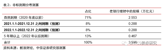 其二是对金融市场的外部性。截至2019年底,预期收益型理财产品存续规模仍高达13.3万亿元,占所有理财产品总量的一半以上。倘通过发行新的净值型产品承接其资产,则即使分散到两年,对市场资金面的影响也相当可观。倘不满足资管新规要求的资管产品抛售其资产,进行强制清盘,也会对金融市场产生较大冲击。此外,非标资产的处理也对金融机构的承接能力提出了极高的要求。资管新规落地伊始,有监管人士参加一场资管机构业内闭门研讨,并就资管新规做出重要解读,透露到,“非标目前(2018年初)规模8万亿,到2020年底过渡期结束,自然到期的占比71%,仍然有29%是无法自然到期的。在2017年底统计的时候,13%的存量非标的期限是五年期以上。”(https://cj.sina.com.cn/articles/view/2031864307/791bc9f3019008gdt) 据此推测,在2020-2022年到期的非标占比为16%,我们假设平均分布,2020-2021以及2021-2022年之间,各有8%到期。根据《中国银行业理财市场年度报告(2017)》,非保本理财产品资产配置中,非标准化债权类资产规模在3.6万亿元。假设银行理财中非标期限分布与整体保持一致,则在2020年之前有2.553万亿可以自然到期,而在2021年过渡期结束前共计2.841万亿元自然到期,需要通过其他方式压降(如非标转标、回表等)的规模为0.755万亿元。