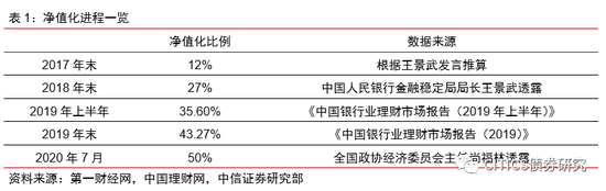 而具体的规模,由于缺乏一致的统计口径,我们仅能整理相关发言及报告,进行大致的推理估算。中国人民银行金融稳定局局长王景武在接受第一财经专访时曾表示:2018年末,银行理财的整理净值化比例为27%,比2018年年初大幅提高15个百分点。由此,预计2017年末净值化比例为12%。根据各期《中国银行业理财市场报告》(银行业理财登记托管中心与中国银行业协会联合发布),2019年上半年,银行理财的净值化比例为35.6%,2019年末理达到43.27%。全国政协经济委员会主任尚福林7月也公开表示:截至目前,资管行业整体规模在百万亿元以上,理财产品结构已发生了重要变化,净值型产品余额占比已由新规前的15%大幅提高到了50%左右。按照目前的进度,虽然过渡期延长了一年,但未来整改的压力较大,净值化转型的道路依然任重而道远。